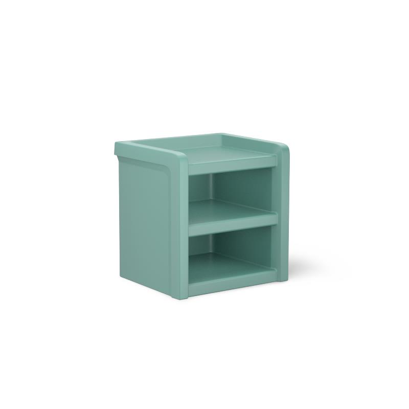 One piece, rotationally molded bedside cabinet with two open shelves for open storage of personal items