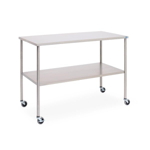 • 304 stainless steel construction • Sealed reinforcing channels provide rigidity • 3″ hard rubber casters (two with brakes) • 16″ clearance between shelves • Supports up to 250 lbs evenly distributed