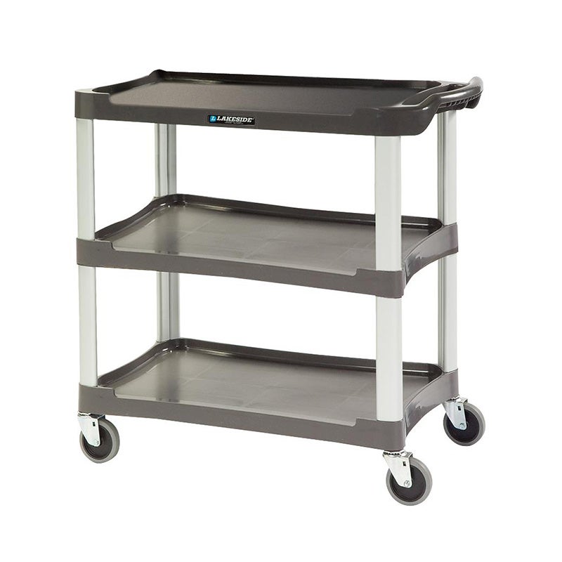 - Features molded black plastic shelves with a 1” lip on all sides, brushed aluminum legs with locking casters, bottom corner bumpers and push handles on both ends