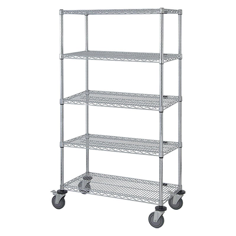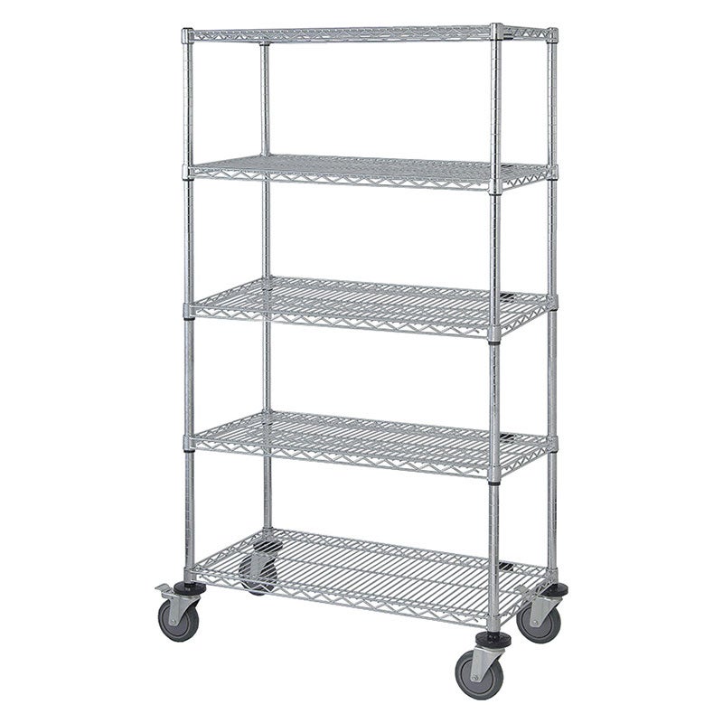 Wire shelving storage unit with mobility features add versatility and flexibility for storage operations.